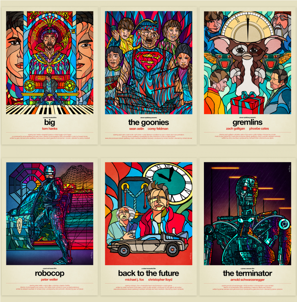Big, Les Goonies, Gremlins, Robocop, Retour vers le futur et Terminator façon vitraux par Van Orton.